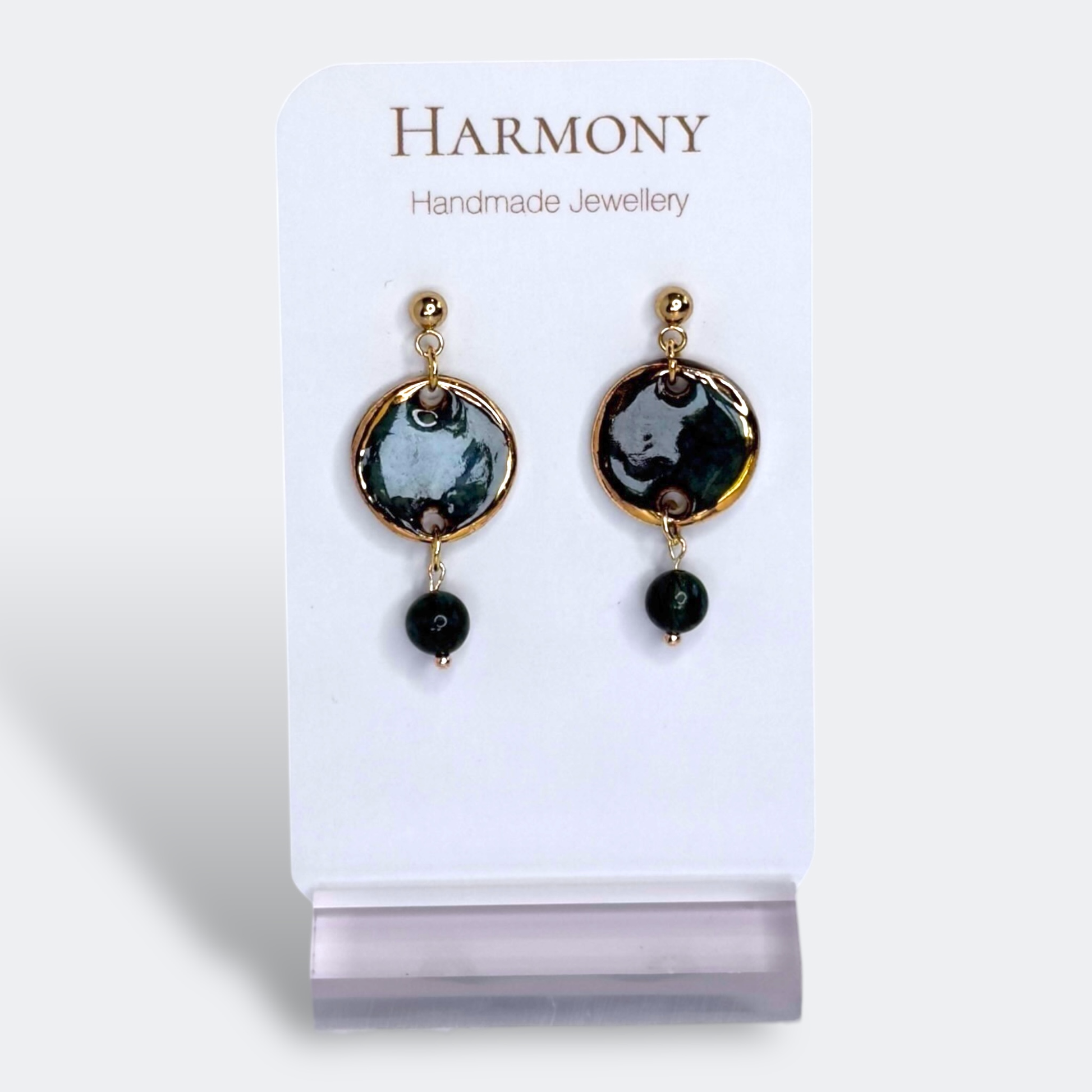 Midnight Teal Circle and Stone Ceramic Drop Earrings